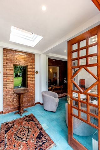 The linear block is an extension to an existing structure originally designed by Suhail & Pasha. The aim of the new block was to improve the quality of space for the clients entertainment area. This was achieved by increasing the rooms with an extension that would add more light into the space. The newly added block is strategically placed to intake natural light from the vast open front lawns. The white walls surround a teal coloured floor tiles with hints of brick jaali and wall.